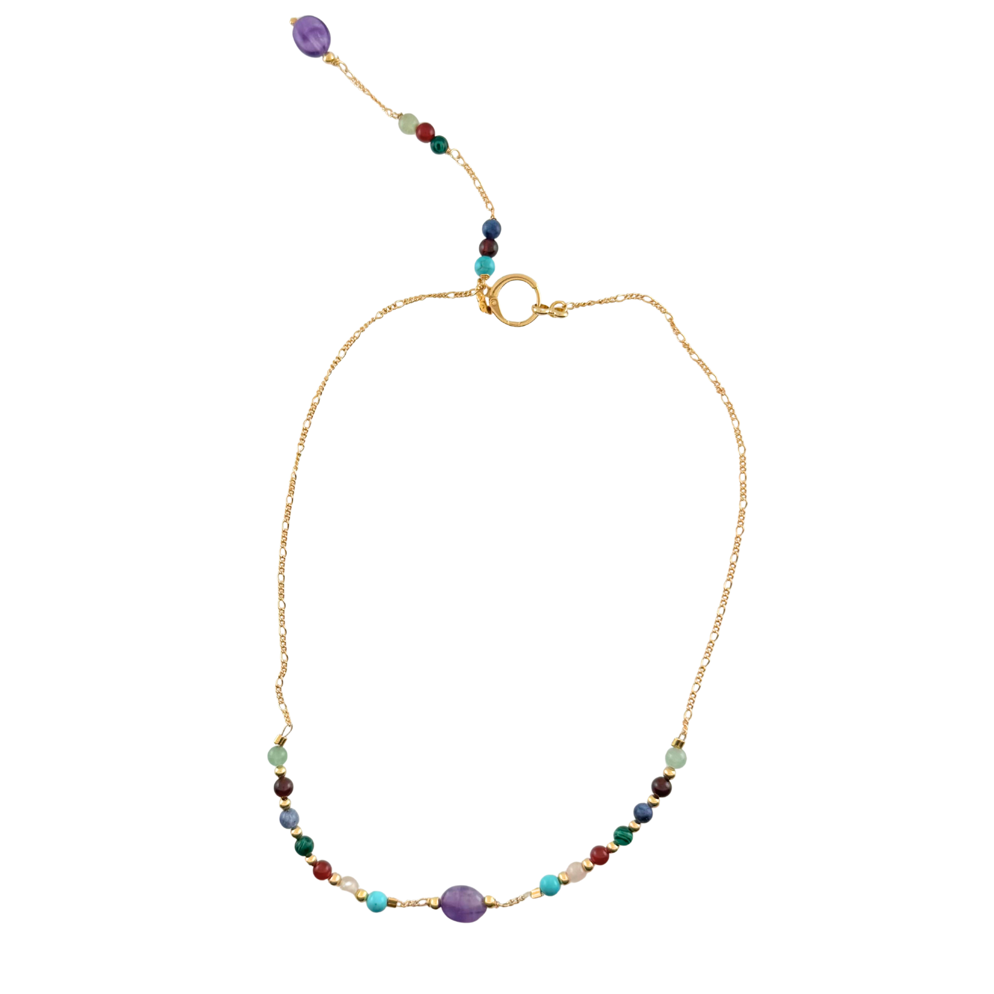 This elegant necklace combines the refined aesthetics of semi-precious gemstones with sophisticated design. The piece features a delicate gold chain adorned with carefully selected 4mm semi-precious stones, creating a harmonious gradient of natural color and texture. At the center, a striking amethyst stone serves as the focal point, complemented by an ornate backdrop pendant that enhances its visual impact. The backdrop design adds dimensional depth and elevates the overall composition, making this necklace suitable for both everyday wear and special occasions. A versatile accessory that showcases the inherent beauty of natural gemstones.