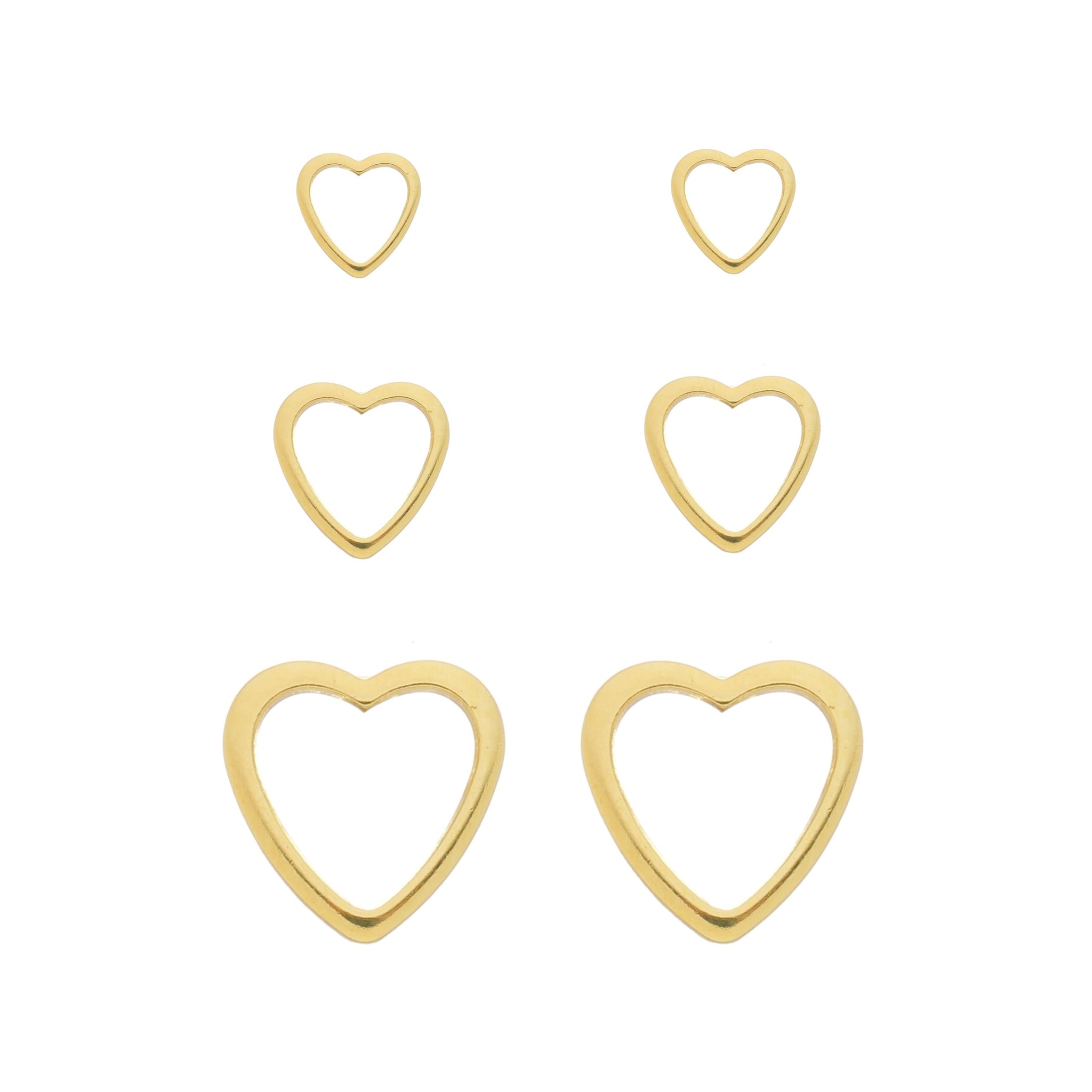 This set includes three sizes of gold-plated heart-shaped studs, offering versatile options for elegant everyday wear or special occasions. Crafted with attention to detail, these studs provide a subtle yet sophisticated accent to any outfit, combining classic design with durable plating for lasting shine. Ideal for those seeking refined, timeless jewelry pieces.